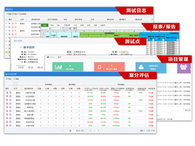 平臺(tái)側(cè)采用工業(yè)級(jí)標(biāo)準(zhǔn)的J2EE平臺(tái),具有很強(qiáng)的安全性和可擴(kuò)展性。平臺(tái)端功能同樣強(qiáng)大,提供了項(xiàng)目管理、測(cè)試點(diǎn)管理、測(cè)試日志管理與分析、室分評(píng)估、一鍵式報(bào)表/報(bào)告生成等功能。