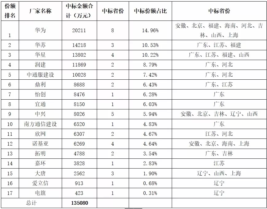 2018年3月5日,驚蟄,一個足以載入通信網(wǎng)優(yōu)史冊的日子,這一天印證了羅振宇在時間的故事里分享的“大者恒大,強者恒強”的預言,在全國首輪11個省份涉及44.63億元的網(wǎng)優(yōu)集中采購招標盛筵中,華蘇一舉斬獲江蘇第1份額,福建第1份額和廣東第4份額(簡稱114),整體份額僅次于華為。